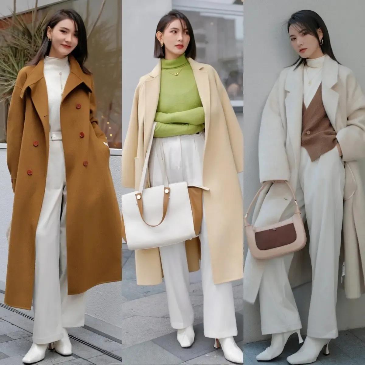 选择西装裤和大衣外套搭配的时候,需要注意的就是多选一些西装领大翻领设计的大衣来搭配会更干练,特别适合职场女性穿搭。
