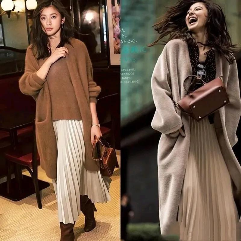 不管你选择羽绒服还是大衣外套搭配百褶裙都可以,一点都不会有违和感,百褶裙穿在身上之后,有一种垂坠感,而且裙摆是外扩的设计最遮肉了,梨形身材的女性,腿粗胯宽的女性,都可以穿百褶裙。
