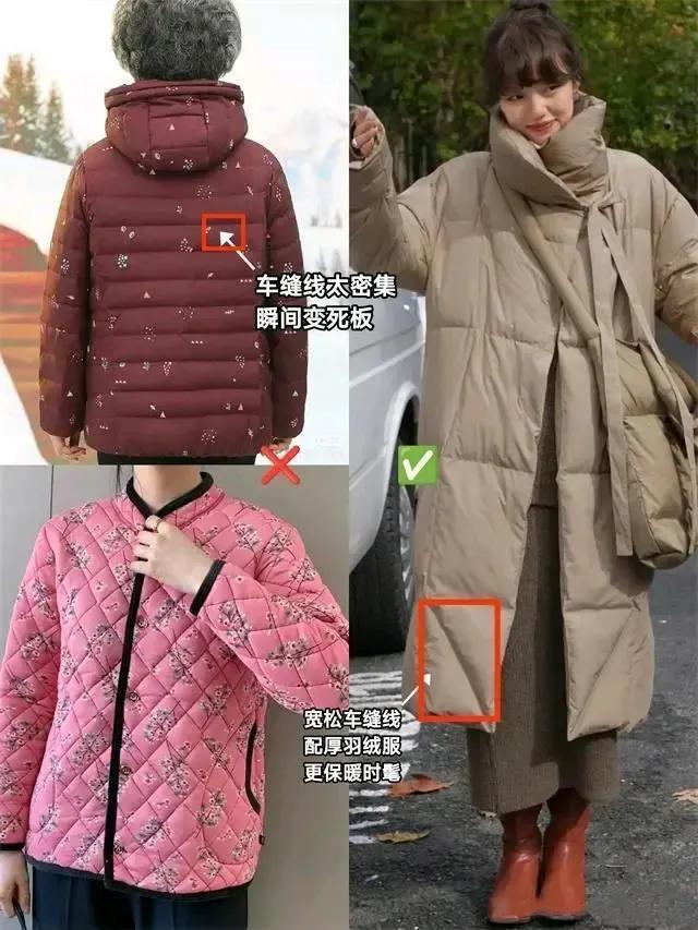 羽绒服可不是所有的版型穿在身上之后都显得年轻貌美,有的羽绒服色彩或者是细节设计上不对的情况下穿在身上变得死板土气,例如下面左边的这一件印花的羽绒服,车缝线设计太过于密集,下面这件粉色的更不用说了,车缝线直接是交叉设计,设计的这么严实,都没有那种自带蓬松感的保暖性也不好,而且又不好看。