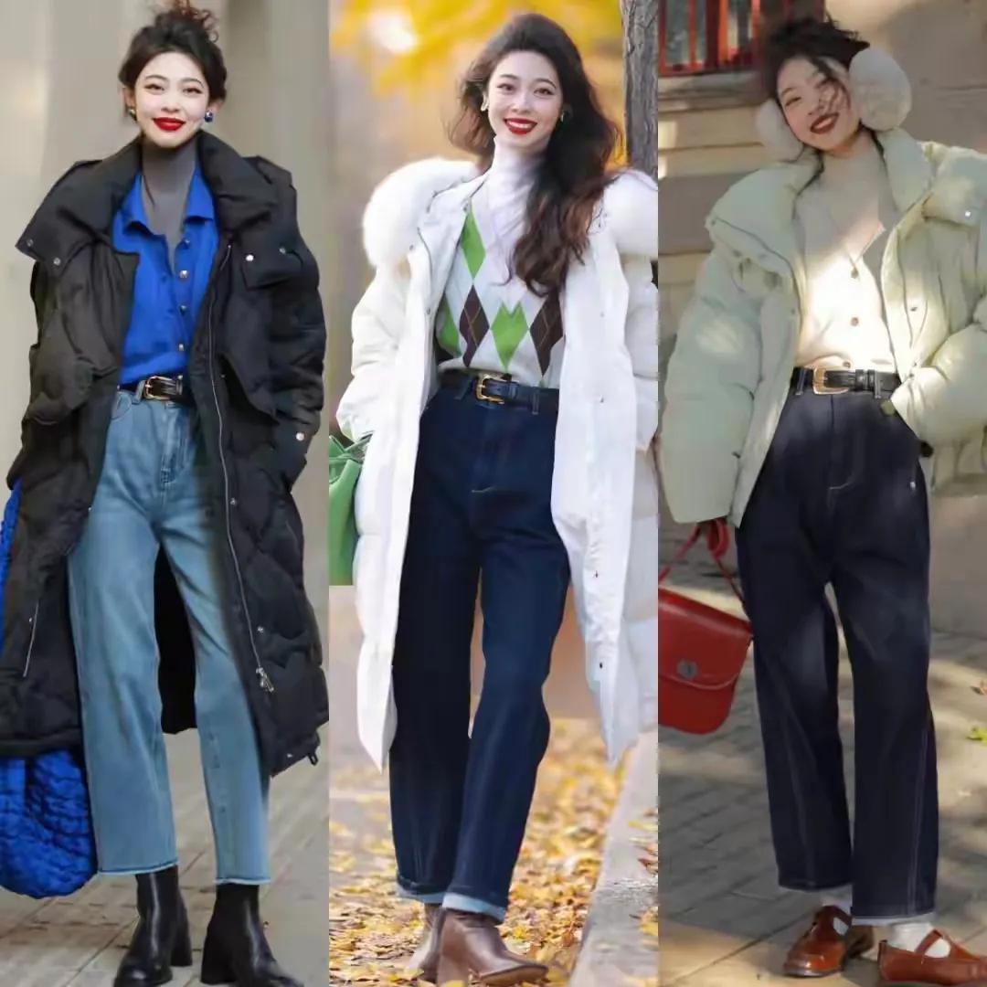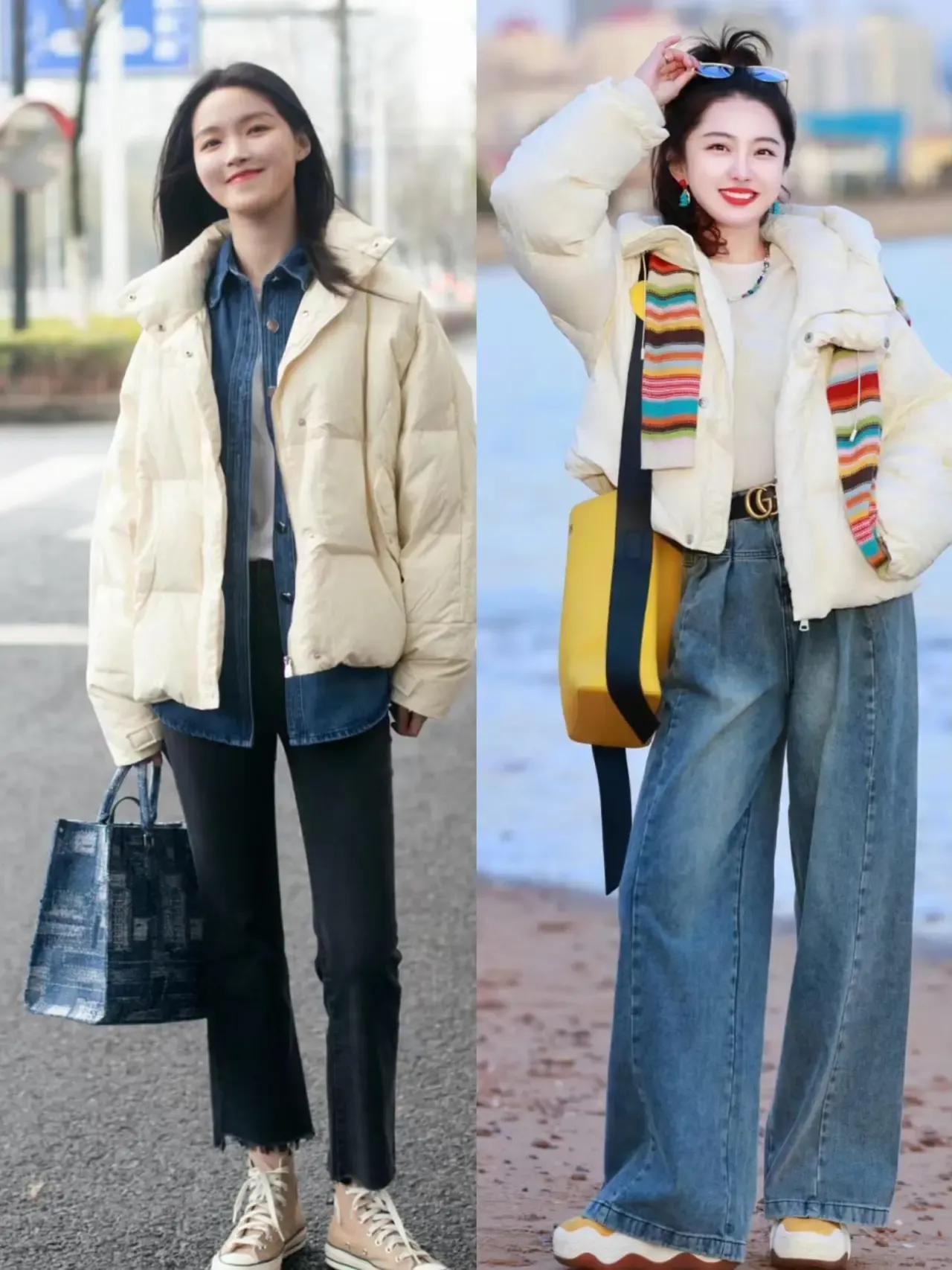 如果你想要走休闲风的情况下,你可以选择牛仔裤搭配上羽绒服,这个时候咱们可以选择像右边的这一套一样,用热复习来组合。