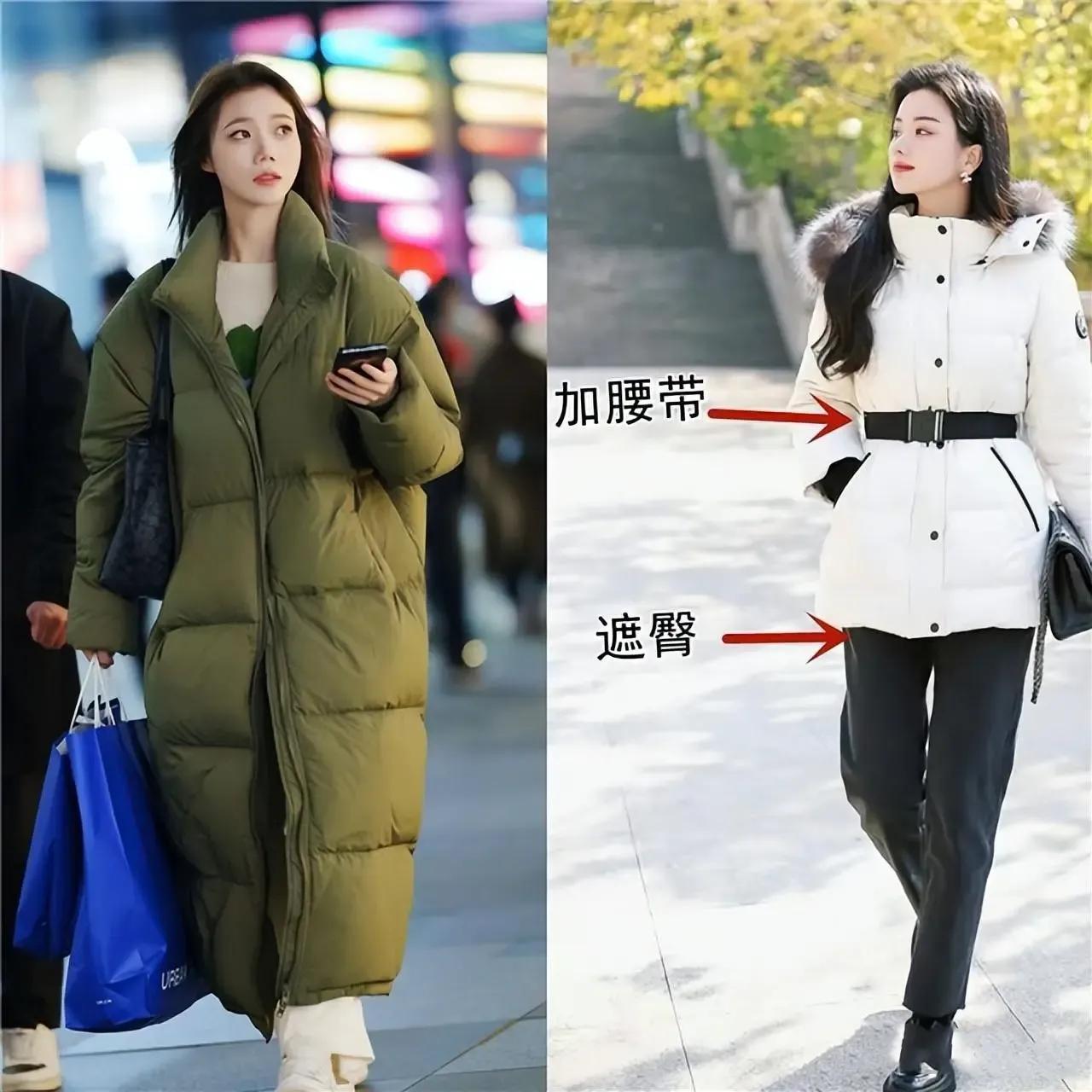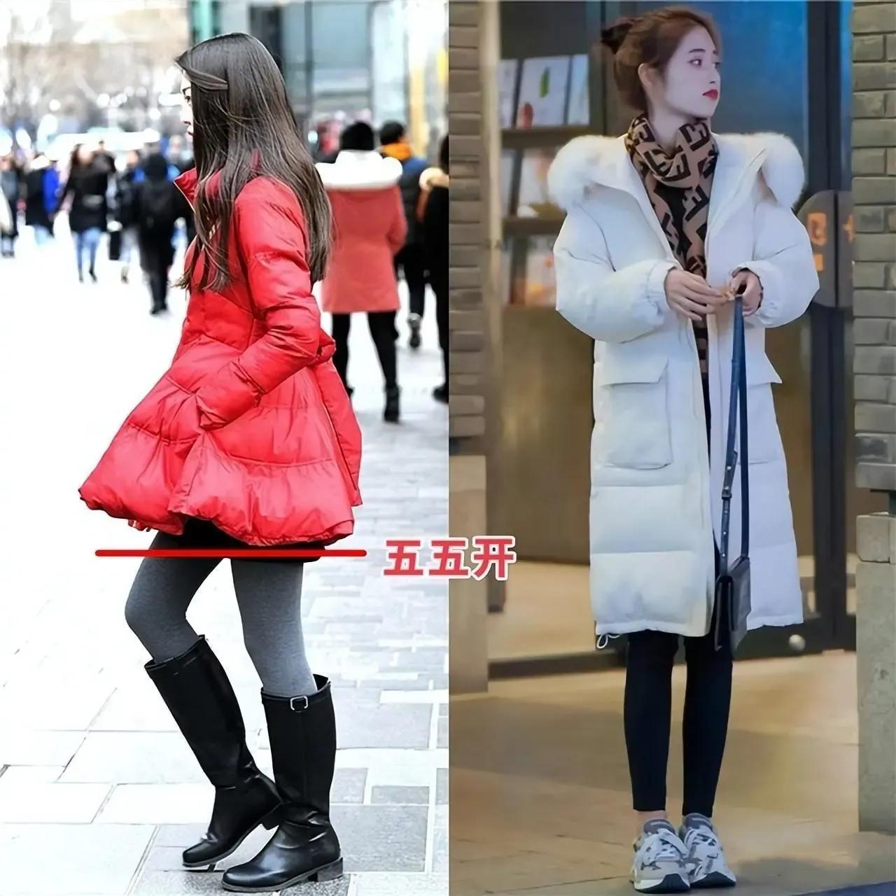羽绒服搭配打底裤,可能大家想象的是像右边的这位素人一样的穿衣造型,穿一条黑色的紧身鲨鱼裤,保暖裤搭配上白色的长款羽绒服,脚踩一双运动鞋,展现出修长笔直的美腿,这么一看,确实很好看,但是对身材的要求极高。