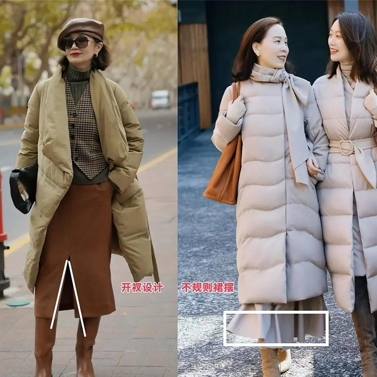 例如下面左边的这位中年女性穿的就是一件大地色的开叉直筒半身裙,脚踩一双同色系的中筒靴,加上一款自带蓬松感的羽绒服外套,内搭格纹马甲,叠穿军绿色的毛衣,这样的穿衣打扮优雅得体。