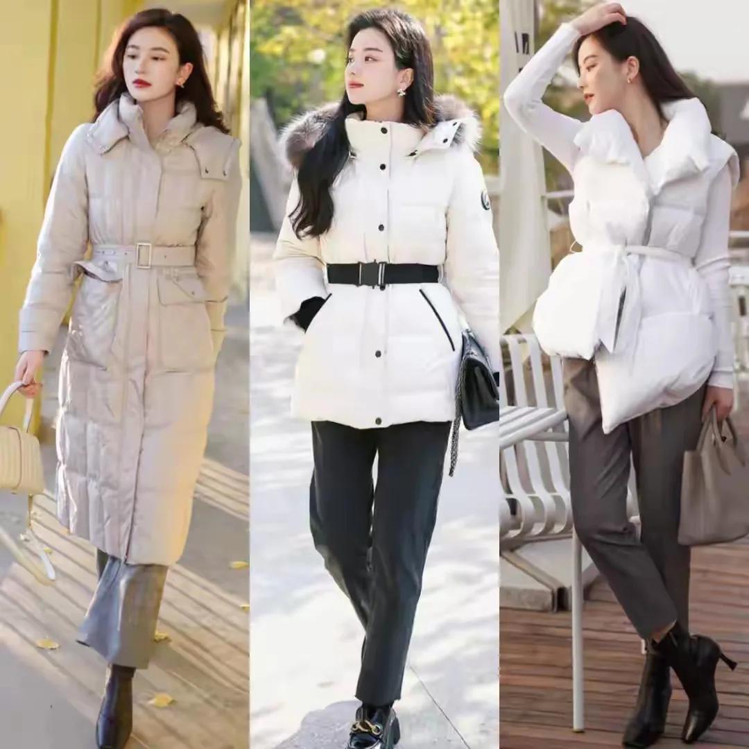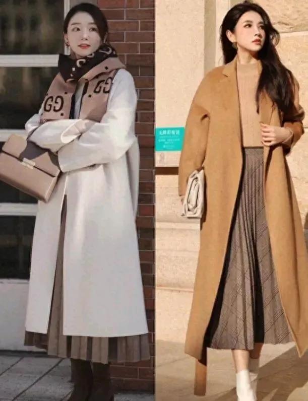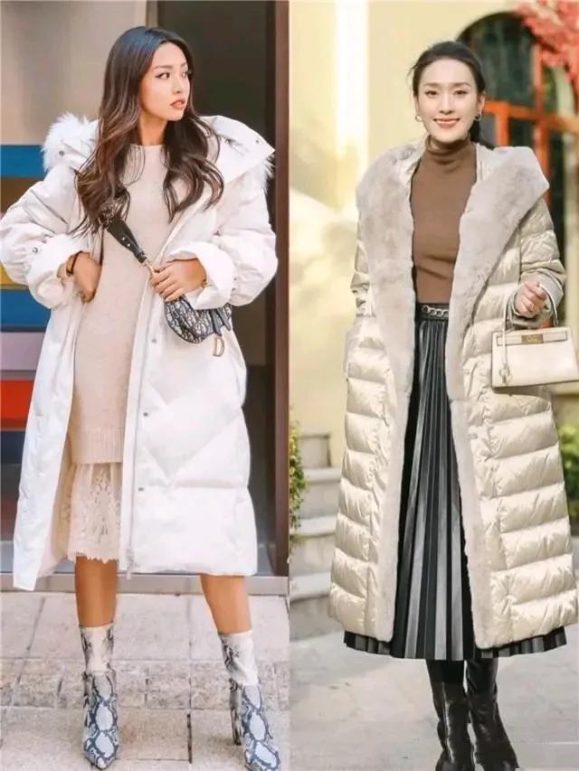 例如,下面这一件浅卡其色的羽绒服内搭黑色毛衣,下半身同样是浅卡其色的百褶半身裙,脚踩一双高跟短靴,这样的穿衣打扮修饰肤色显白显嫩,而且显得很洋气。如果担心容易出错的情况下,你也可以选择右边的这一件藏蓝色的羽绒服,内搭黑色毛衣和黑色的白色半身裙,这样的基础色搭配基本上不会出错。