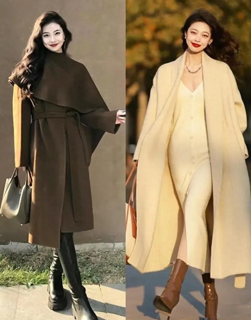 如果身材偏瘦的女性,更不要穿紧身款的衣服,例如下面这两位达人,身材就比较偏瘦,如果穿的过于紧身的情况下,整个人看起来就会有点过于干瘪,不够精神,所以达人选择了杏色的大衣外套,内搭同色系的连衣裙,脚踩一双棕色的短靴,走起路来自带风。