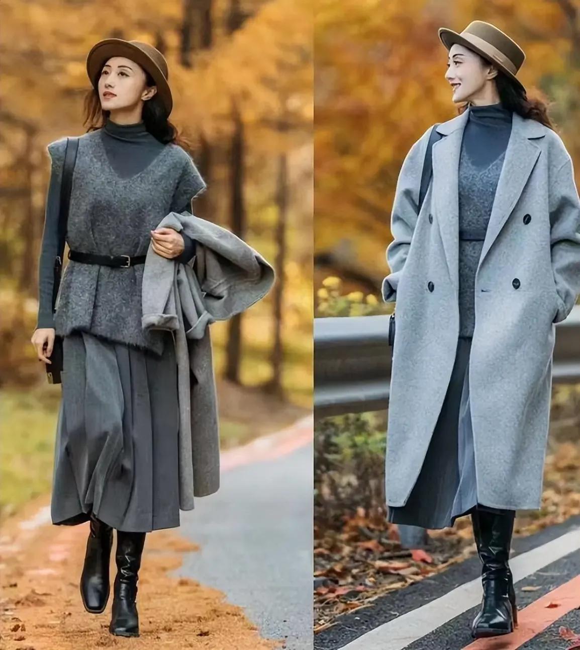 如果你是大骨架的女性,咱们就可以借鉴下面这位达人的穿衣造型了,高个子女生这样穿搭会更好看,一件灰色的大衣外套内搭灰色毛衣和打底衫,加上灰色的压褶半身裙,脚踩黑色的中筒靴,头戴草帽,氛围感直接拉满。
